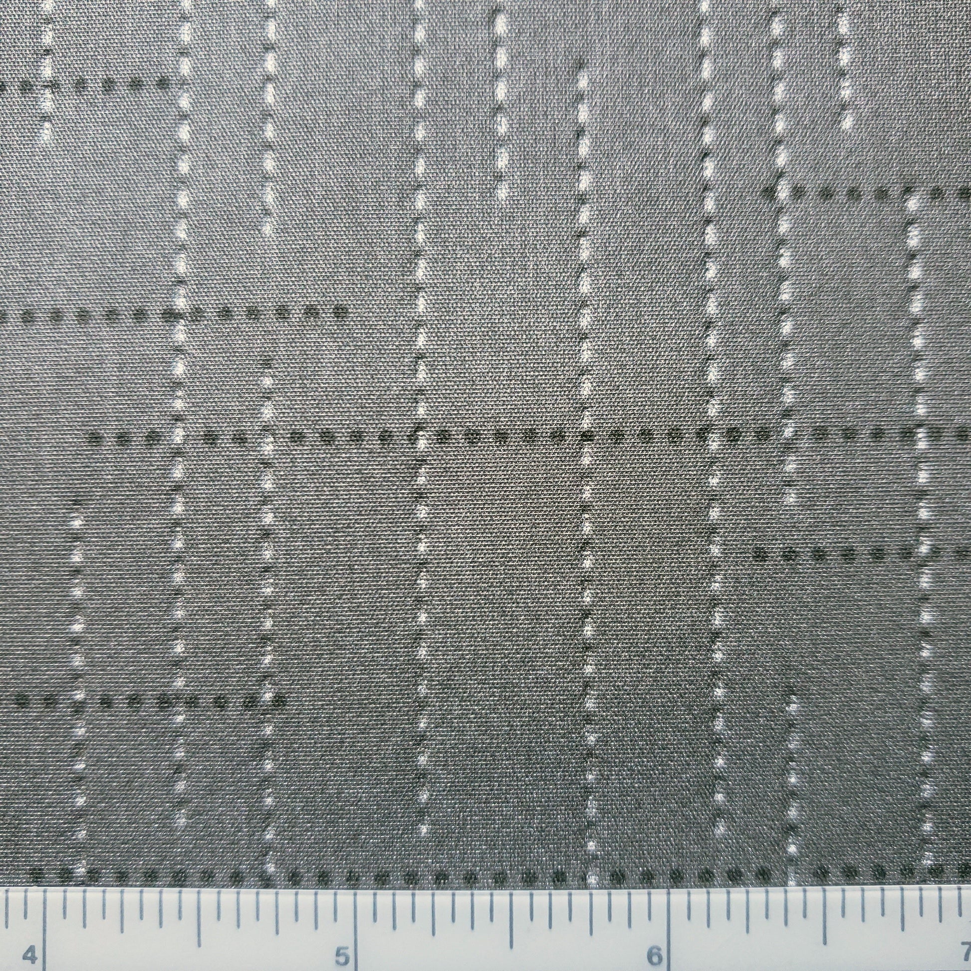 Matte metallic finish on a interested uneven gridded pattern with black dotted lines running horizontally and the silver dotted vertical lines are impressed on a light silvery-gray background