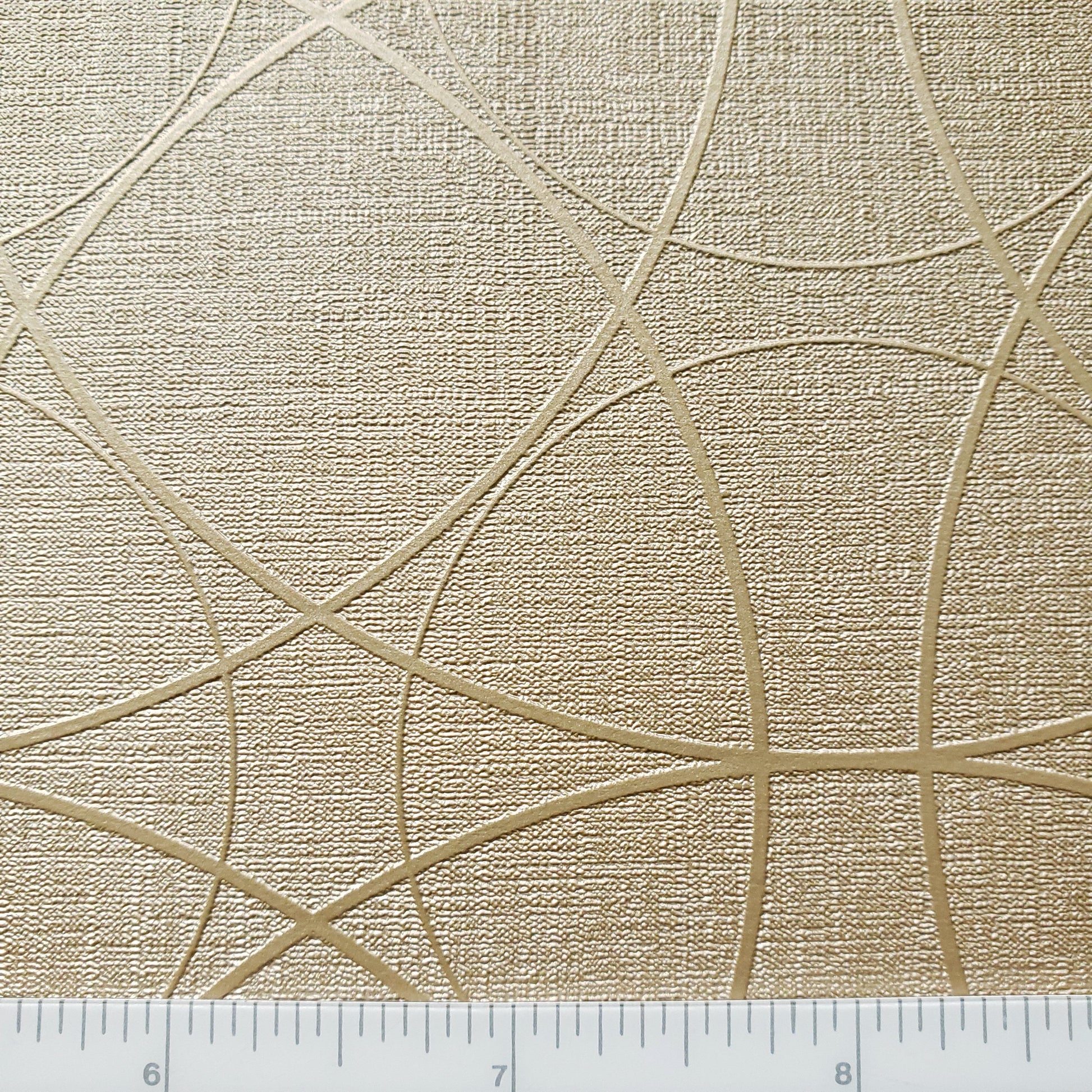 Semi-matte metallic finish on a geometric pattern of overlapping multi-sized circles on a fine weave textured background in a warm, medium gold color