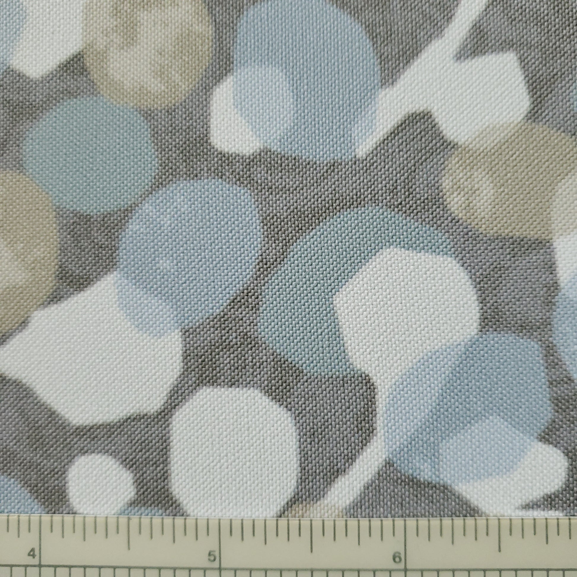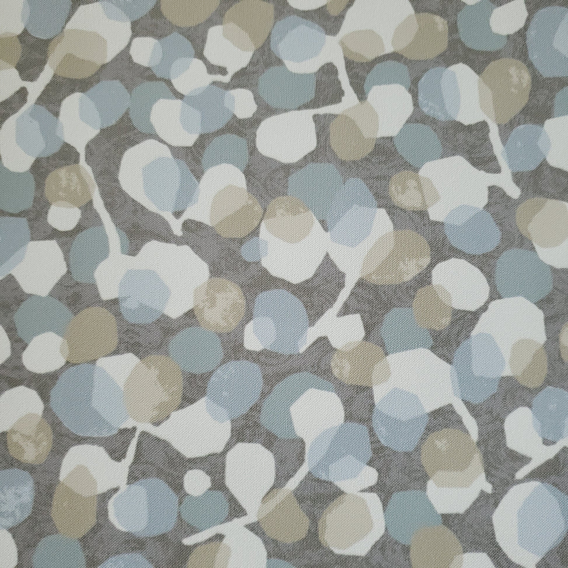 Matte finish on a loosely floral pattern in a light gray blue, light tan and off-white against a medium-dark taupe brown background. Very understated and pretty