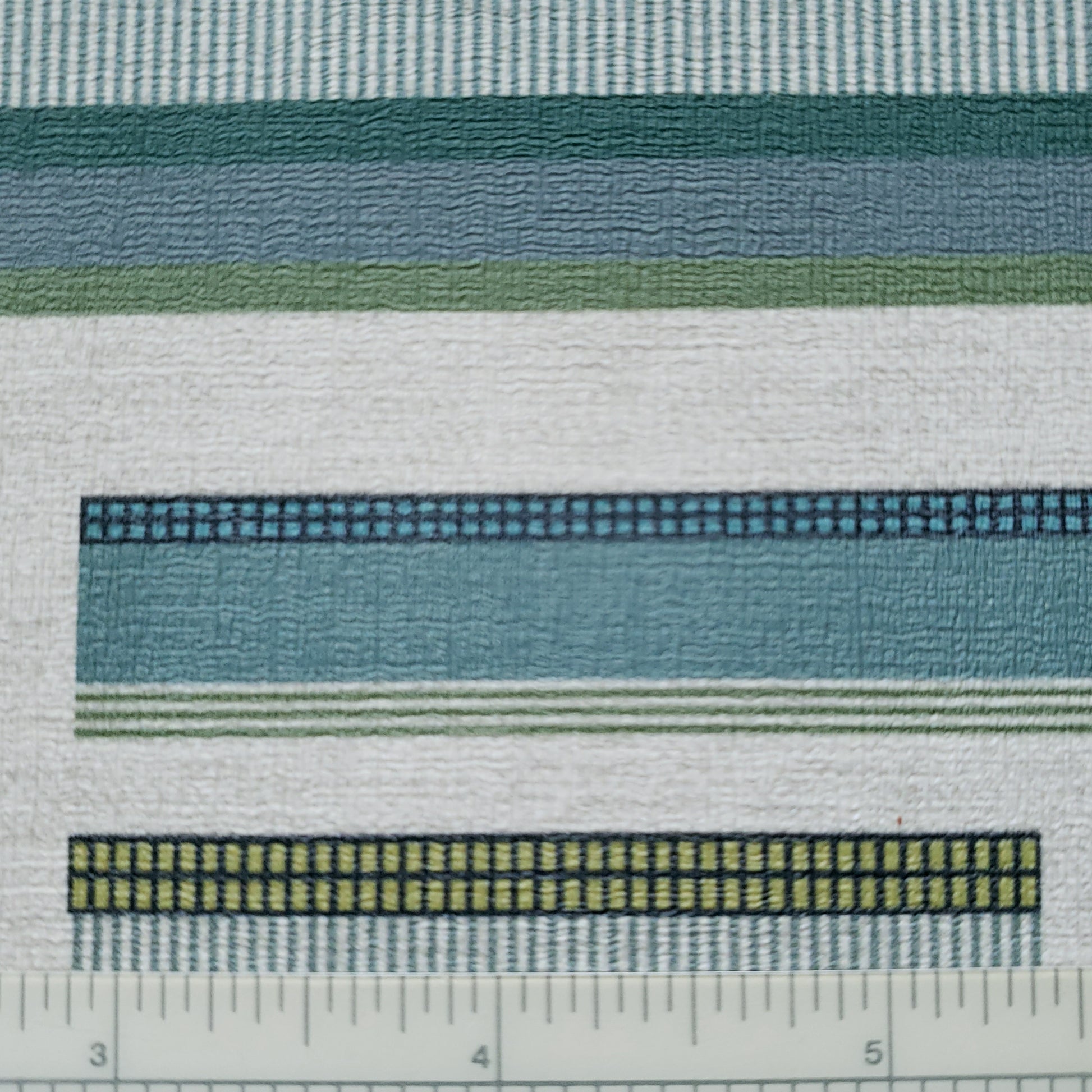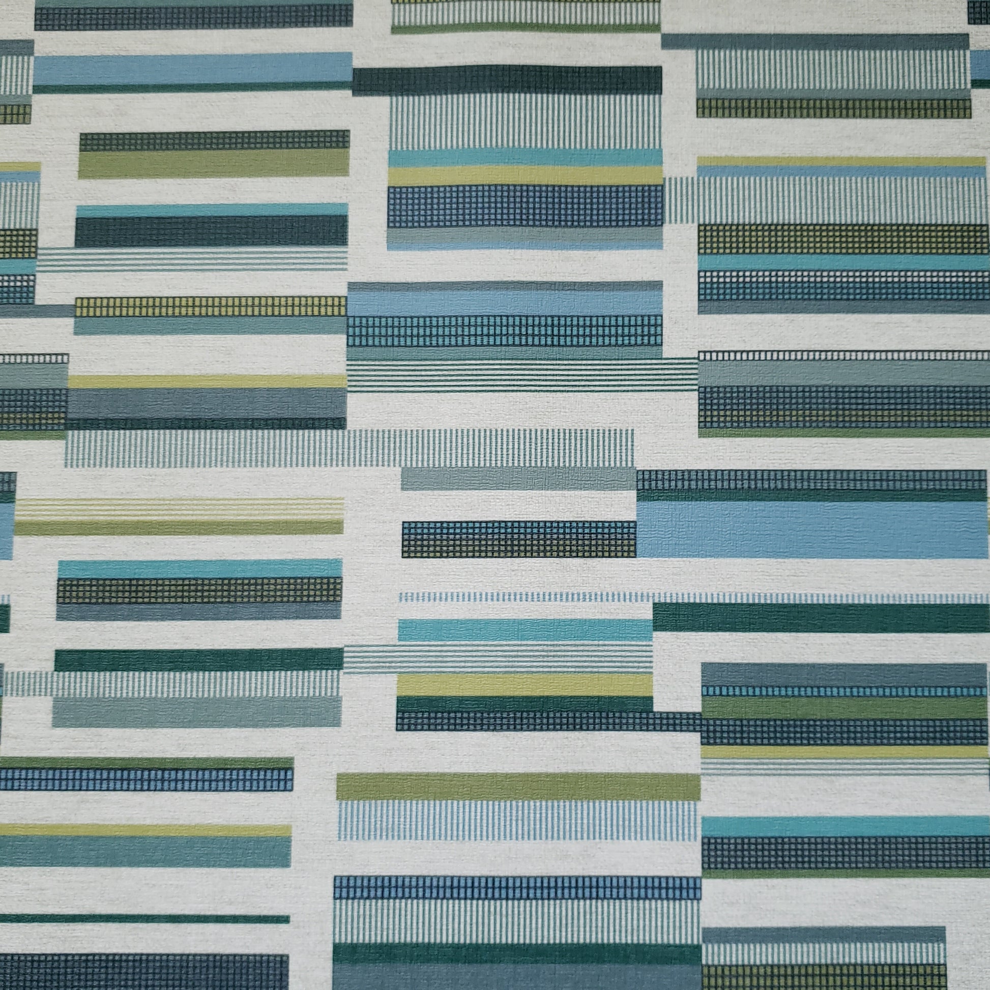 Matte finish on an irregular stacked coin pattern in cool shades of blues, grays and pops of lime green on an off-white background. Very fun.