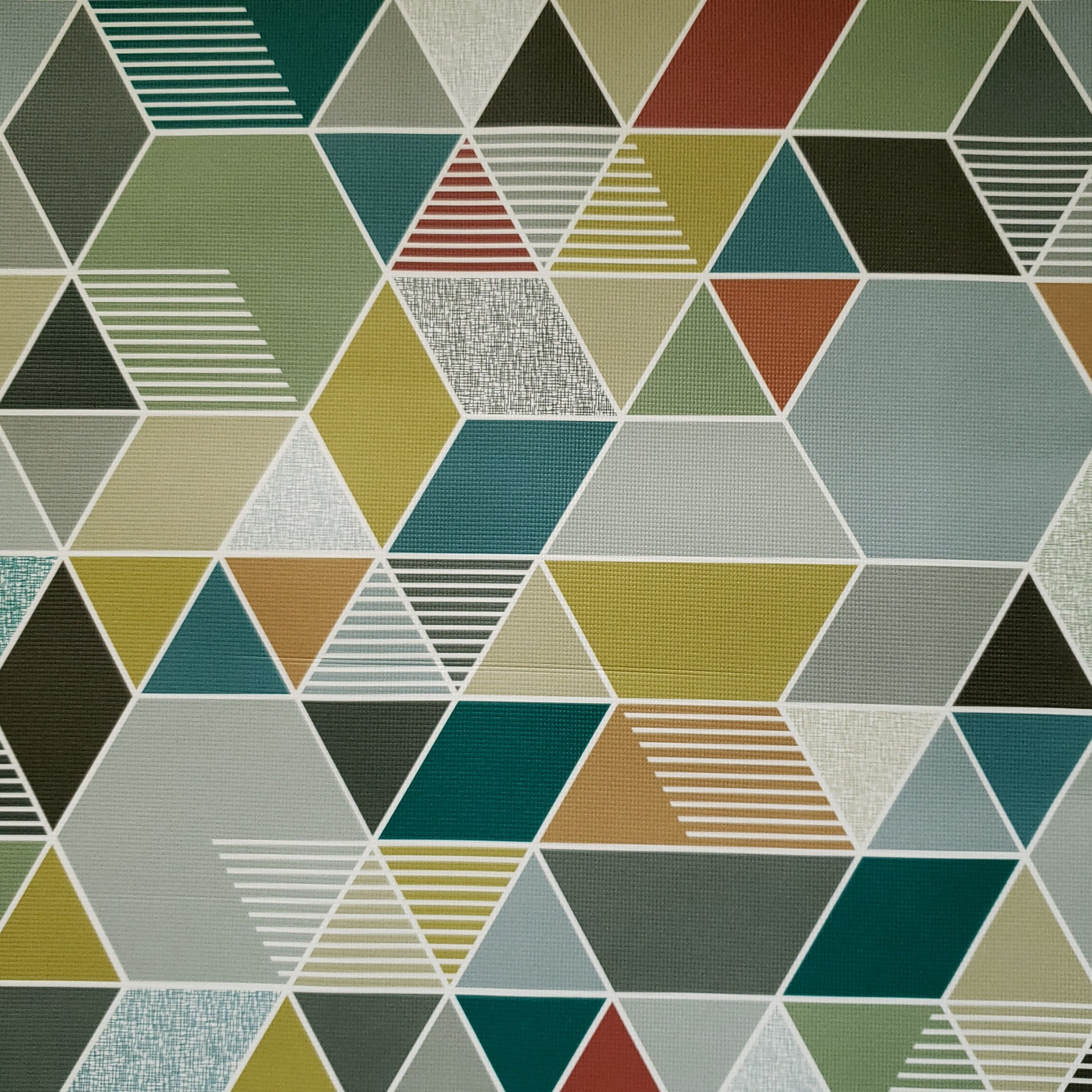 Matte finish on a geometric pattern with diamonds, trapezoids and a rhombus or two in tonal versions of orange, red, gold, turquoise and grays. Definitely some summer fun with this one!
