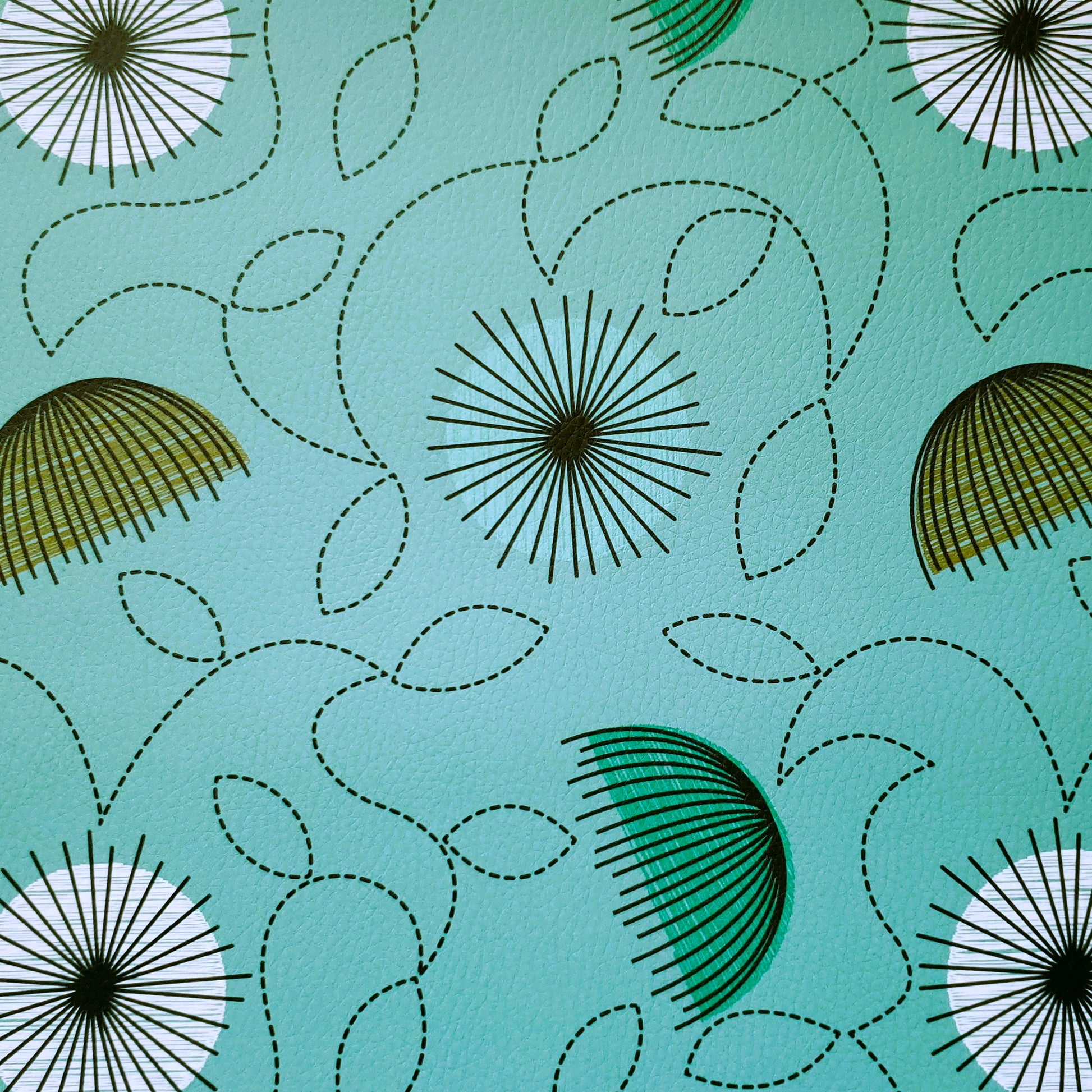 LDI - Enviroleather, matte sheen on a mid century modern pattern of winding vines and radiating starburst flowers in green, brown and white on a medium aqua background with a small animal grain texture