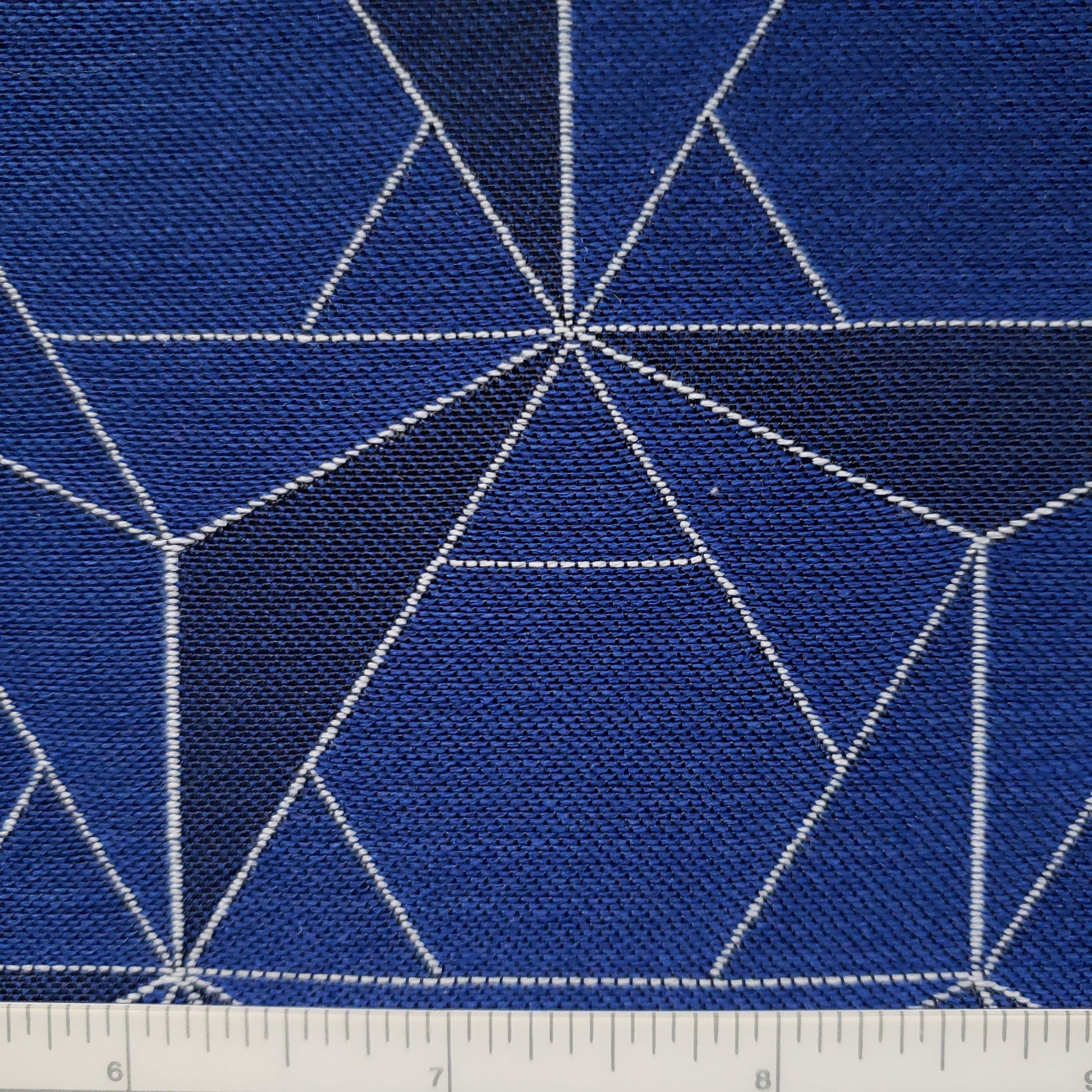 Medium repeating tile pattern in a two shades of deep blue set off by a light gray outline