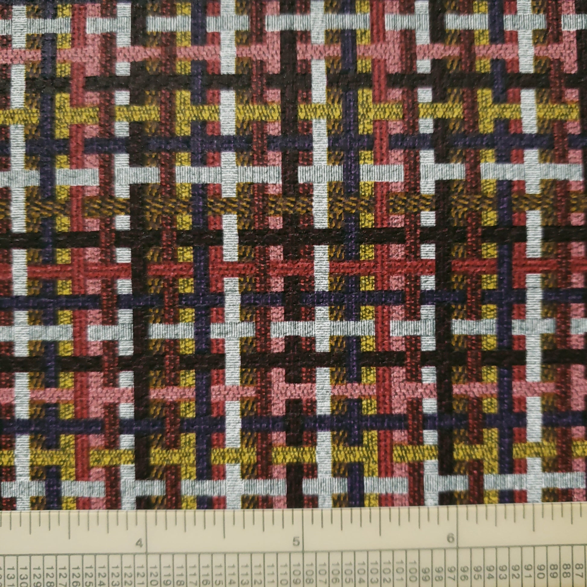 Matte finish on a fun plaid weave in warm shades of coral, burgundy, purple, gold and white